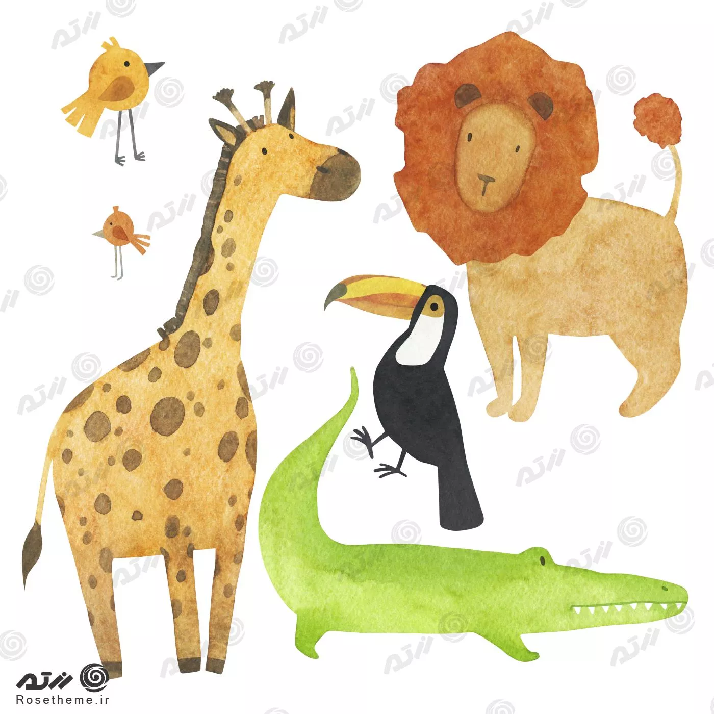 عکس با کیفیت مجموعه آبرنگ با حیوانات ساوانای آفریقایی روی پس زمینه سفید 27320