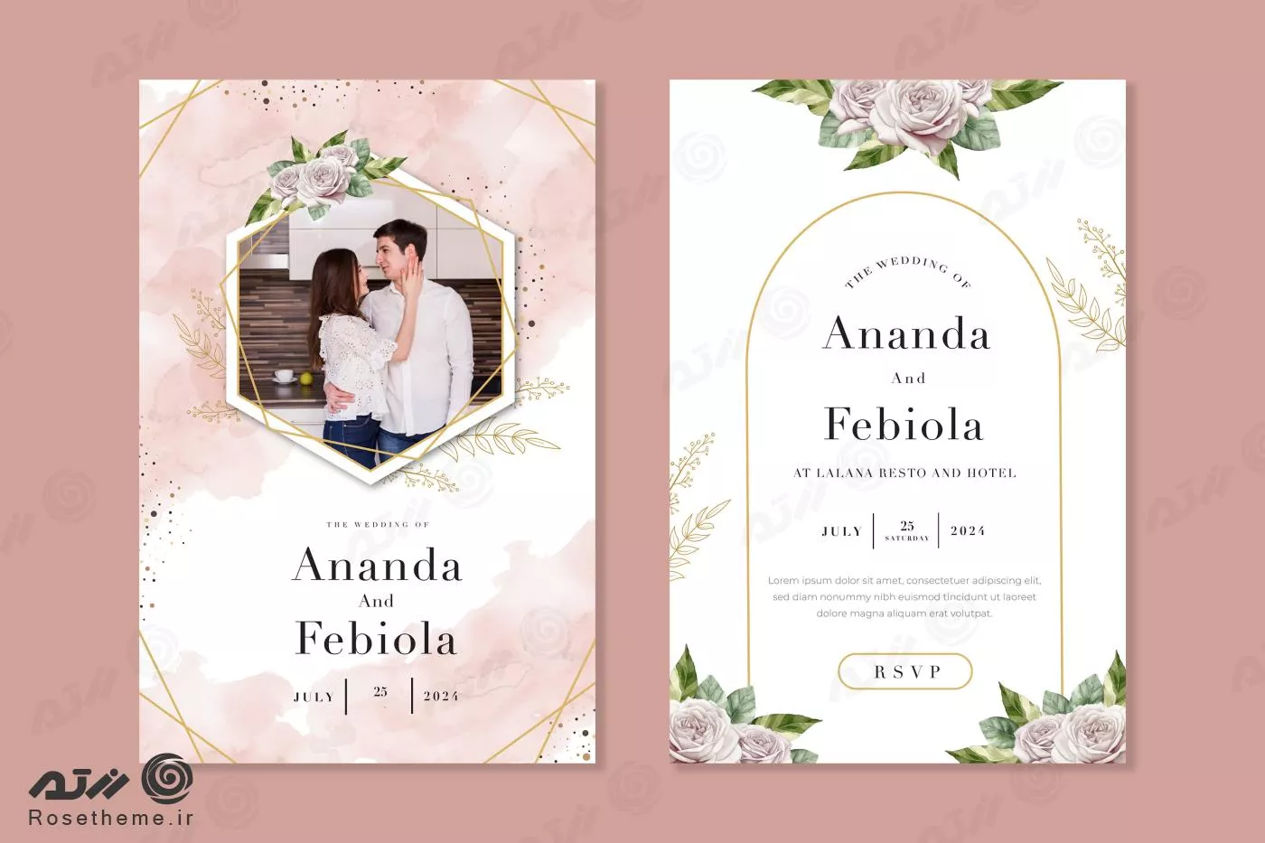 فایل PSD قالب دعوتنامه عروسی دو طرفه با گل آبرنگی بوهمین 27351