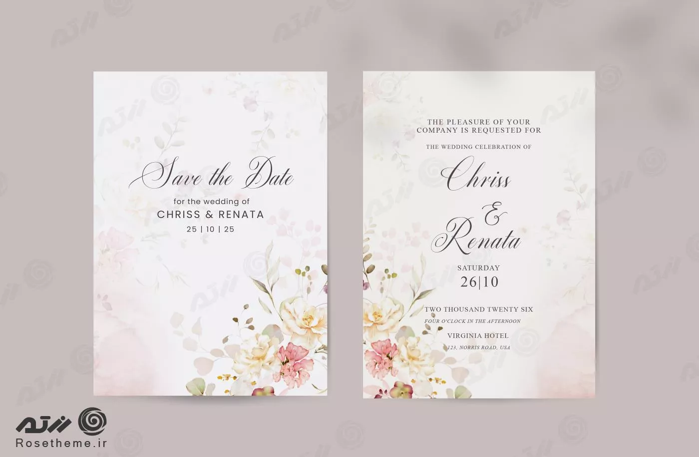 فایل PSD قالب دعوتنامه عروسی دو طرفه با گل آبرنگی بوهمین 27351