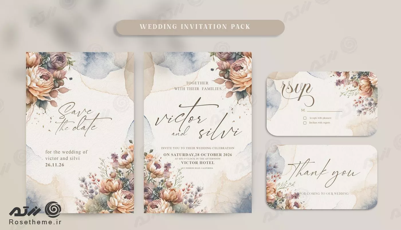 فایل PSD قالب دعوتنامه عروسی دو طرفه با گل آبرنگی بوهمین قابل ویرایش با فتوشاپ 27350