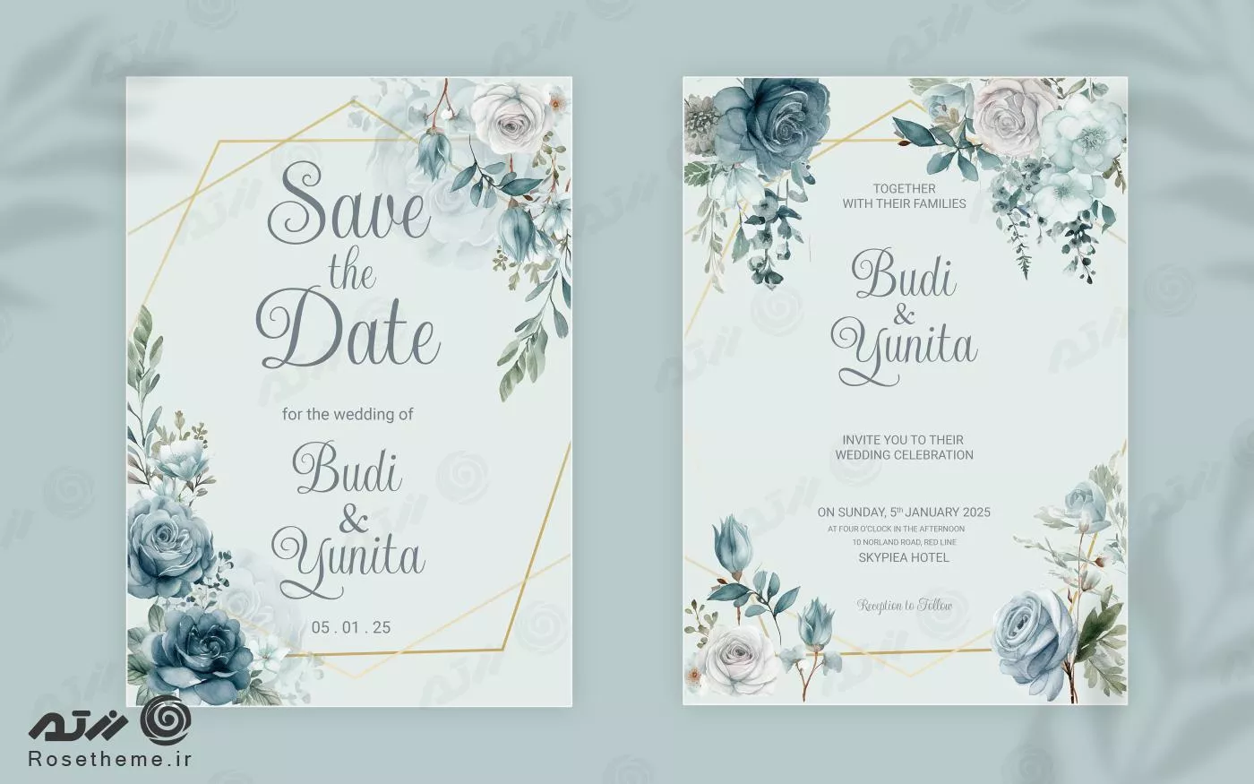 فایل PSD قالب کارت دعوت عروسی دو طرفه PSD با گل های آبرنگی آبی 27385