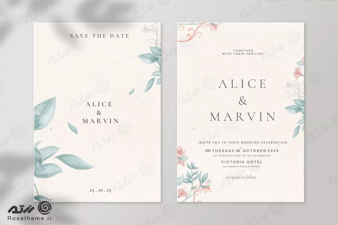 فایل PSD قالب دعوتنامه عروسی با برگ های آبرنگی زیبا 27413