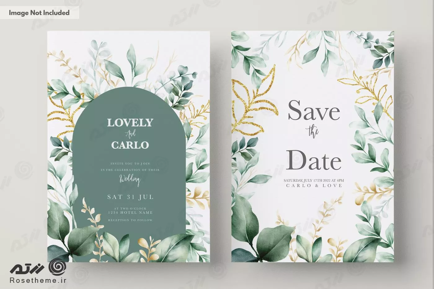 فایل PSD کارت دعوت عروسی آبرنگی با برگ های سبز و تزئینات طلایی 27409