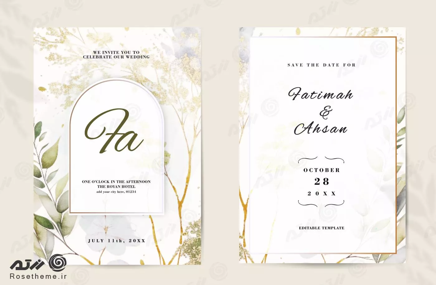 فایل PSD کارت دعوت عروسی آبرنگی با برگ های سبز و تزئینات طلایی 27409