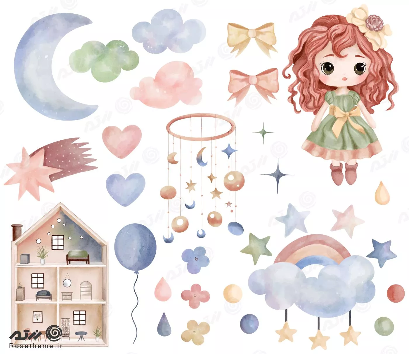مجموعه وکتور دست‌ساز آب‌رنگ عروسک ، خاله بازی ، خانه عروسکی ، عناصر مهدکودک ، ابر ، ماه ، رنگین‌کمان و ستاره‌ها 27296