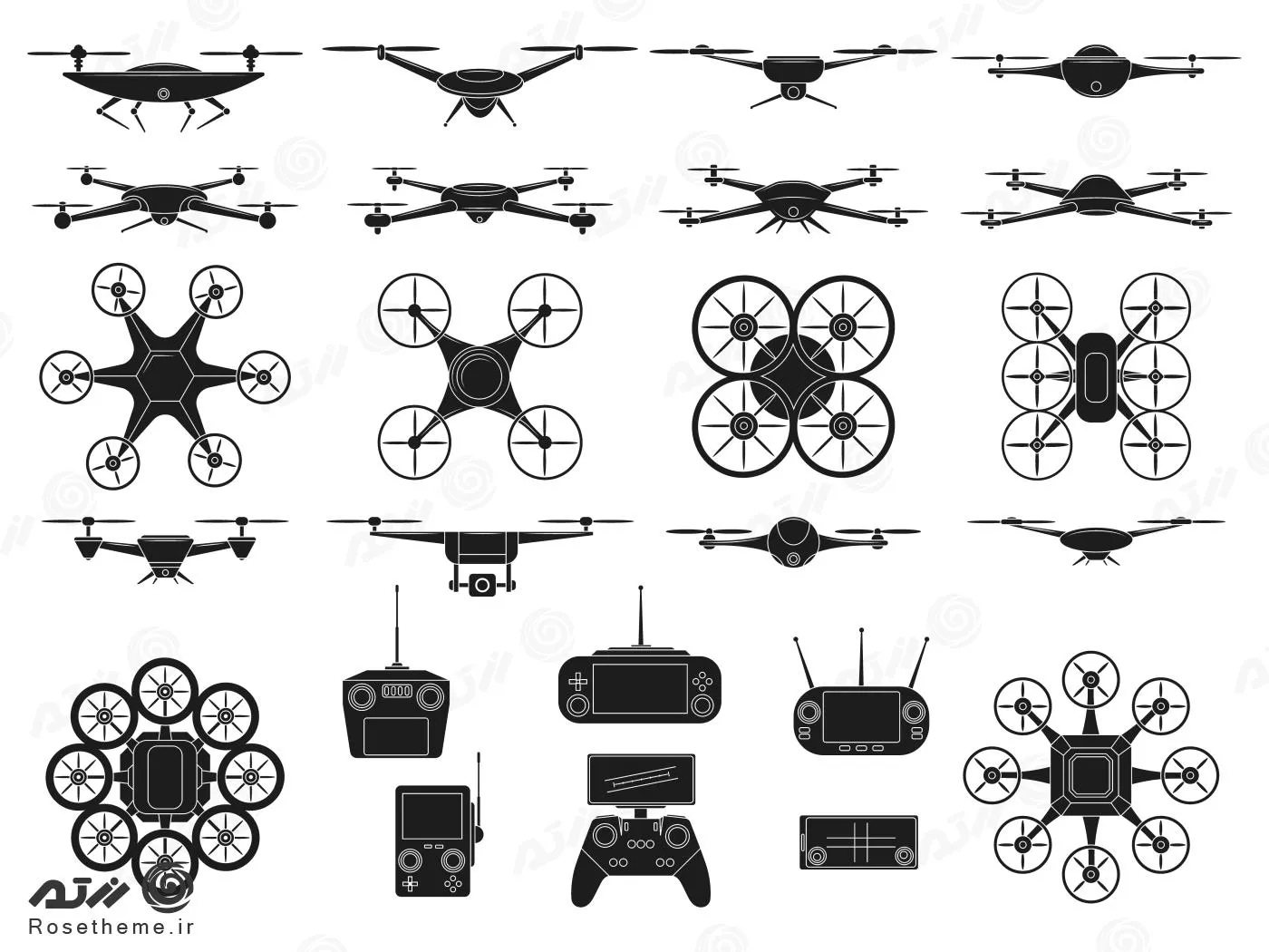 وکتور EPS آیکون های پهپاد، کوادکوپترها، وسایل نقلیه، نمادهای سیلوئت، پهپادهای پرنده بدون سرنشین مدرن، تصویر برداری وکتور 27943