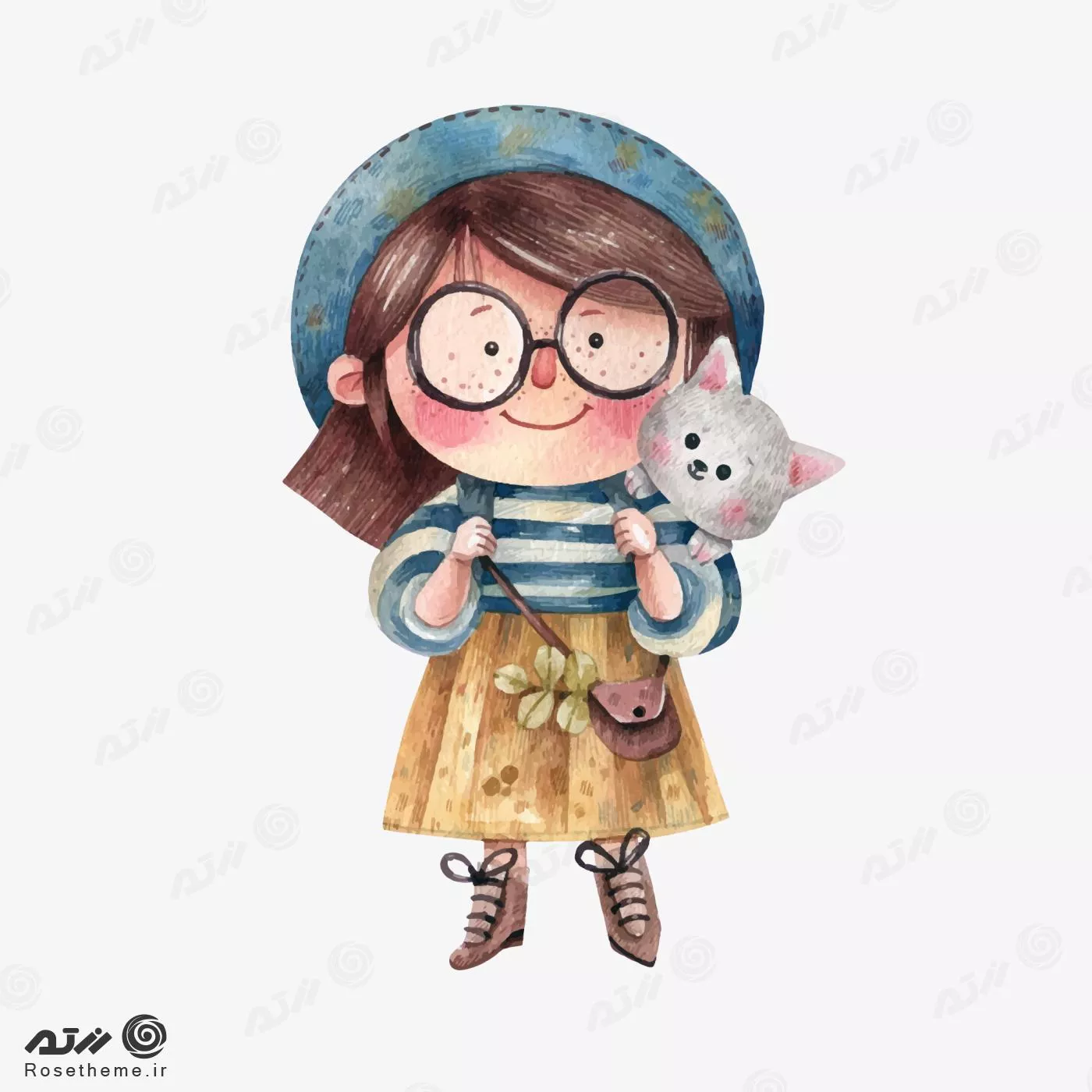 وکتور EPS تصویر آبرنگی دختر بامزه با گربه 27242