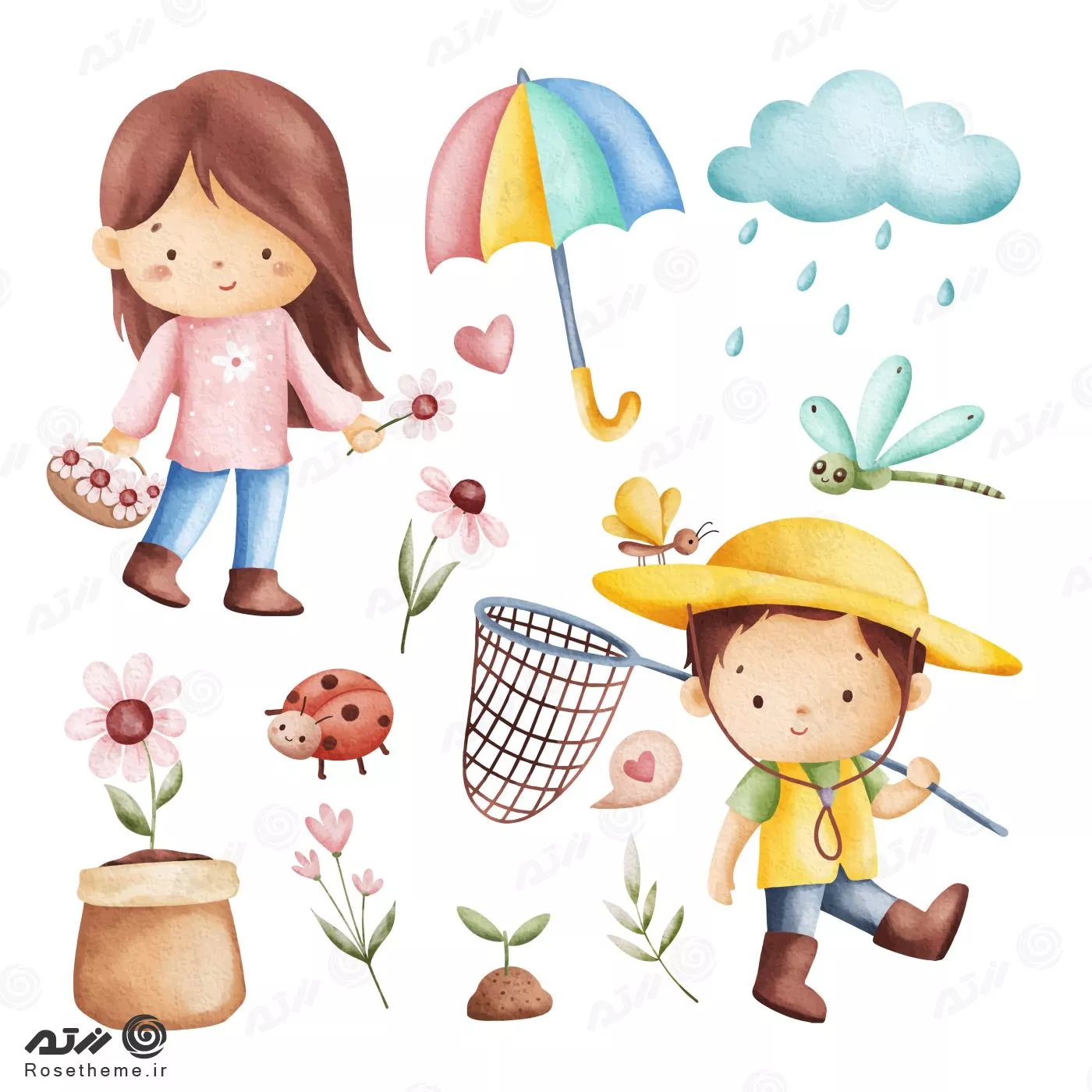 وکتور EPS مجموعه تصاویر وکتوری عناصر بهاری کودکان با سبک آبرنگی 27292